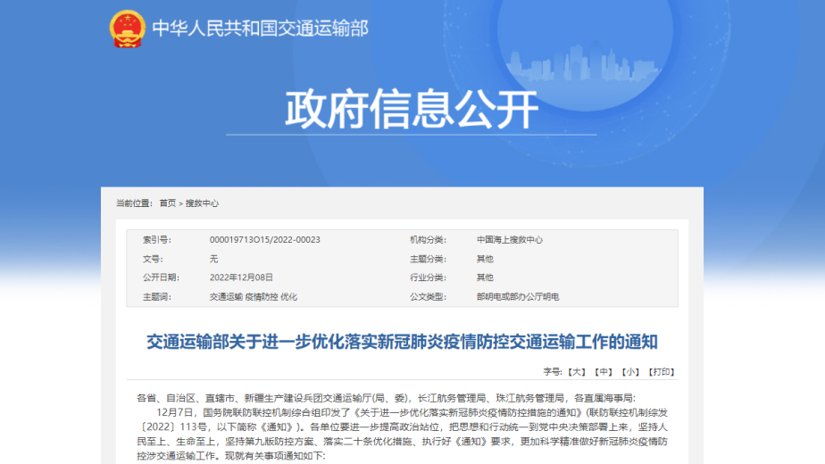 12月8日,《交通運輸部關于進一步優(yōu)化落實新冠肺炎疫情防控交通運輸工作的通知》(以下簡稱《通知》)正式發(fā)布?!锻ㄖ访鞔_,要更加科學精準做好新冠…