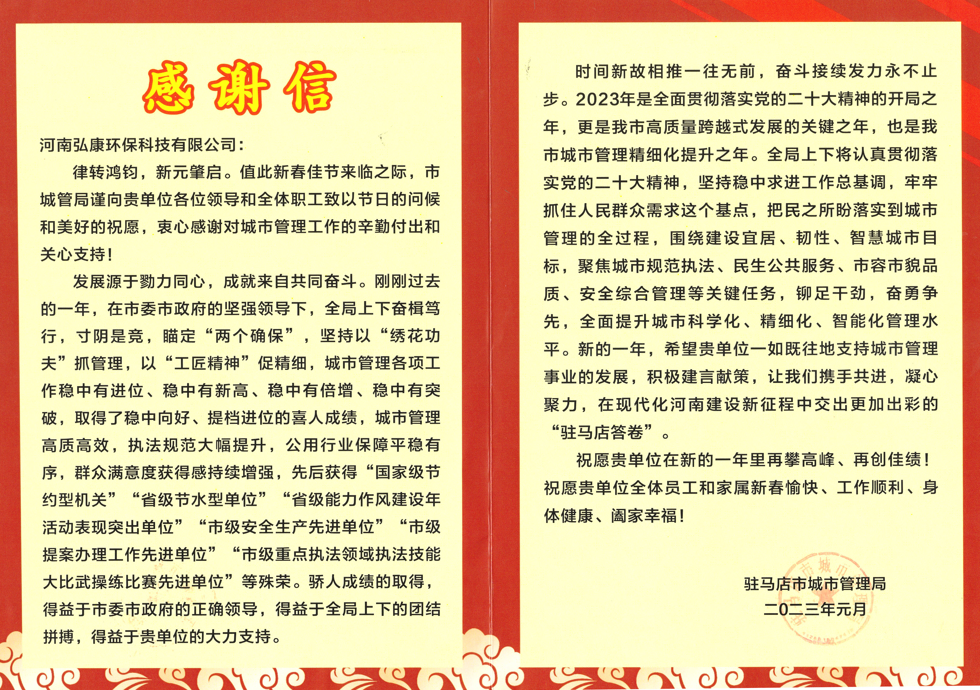 河南弘康環(huán)??萍加邢薰臼盏今v馬店市城市管理局新春感謝信 新春佳節(jié)來臨之際,河南弘康環(huán)??萍加邢薰臼盏今v馬店市城市管理局發(fā)來的感謝信,對過去…